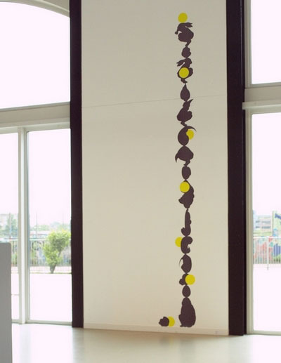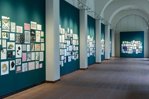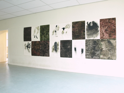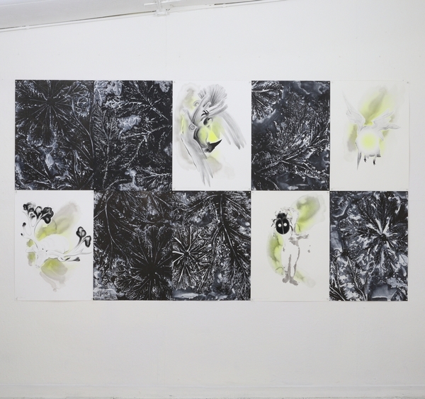 Een solo-installatie van tekeningen en vegetatiedrukken in de etalageruimte van de Vishal.