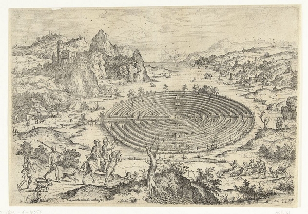 Het Kretische labyrint, ets op papier. Prentmaker: Hieronymus Cock naar ontwerp van Matthys Cock, uitgever: Hieronymus Cock, Antwerpen ca. 1551. Collectie Rijksmuseum |
